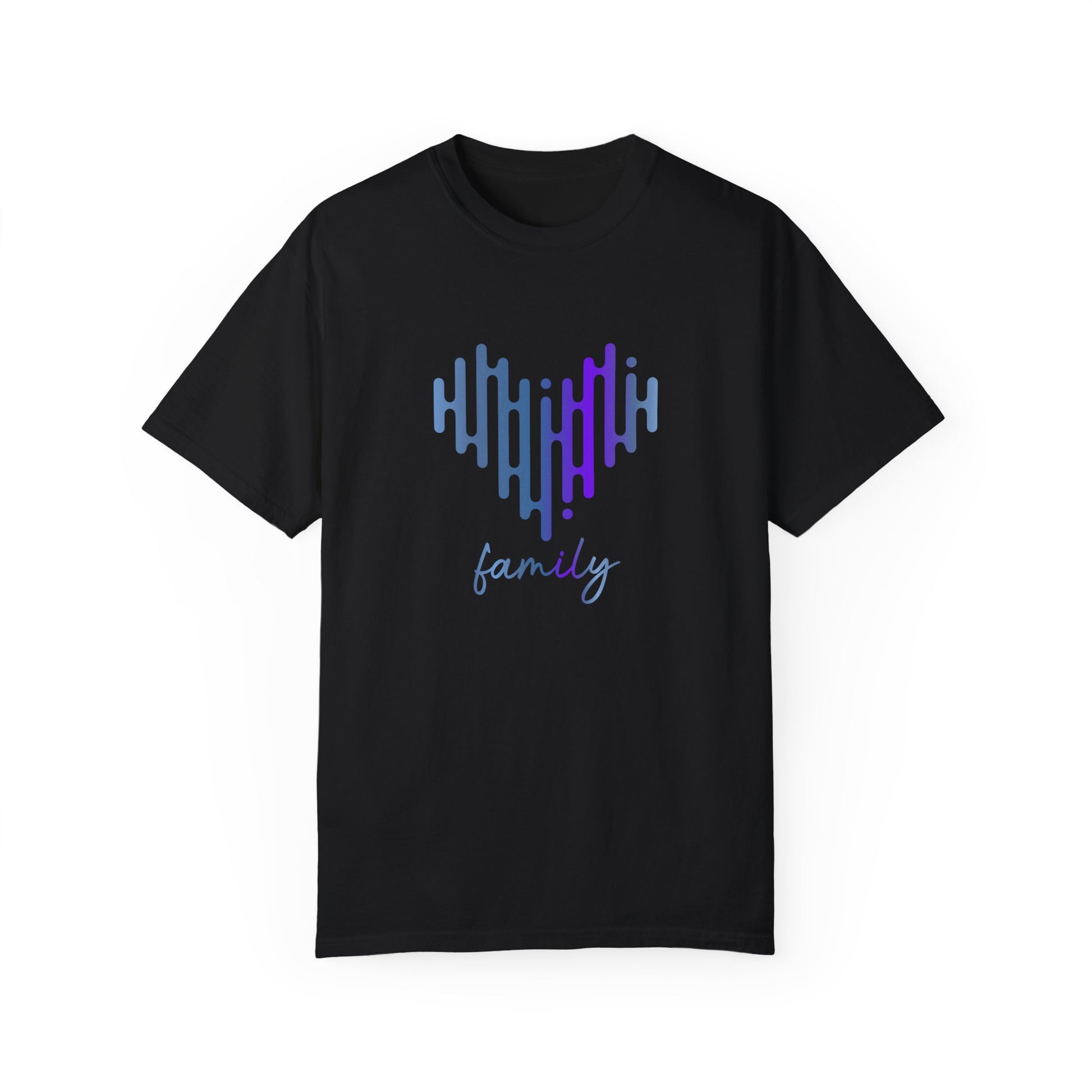 Embrace the love and warmth of your family with the "Family Tee"! This unisex garment-dyed T-shirt features a modern and artistic heart-shaped design with a blend of soothing purple and blue hues, symbolizing the strength and unity of family bonds.