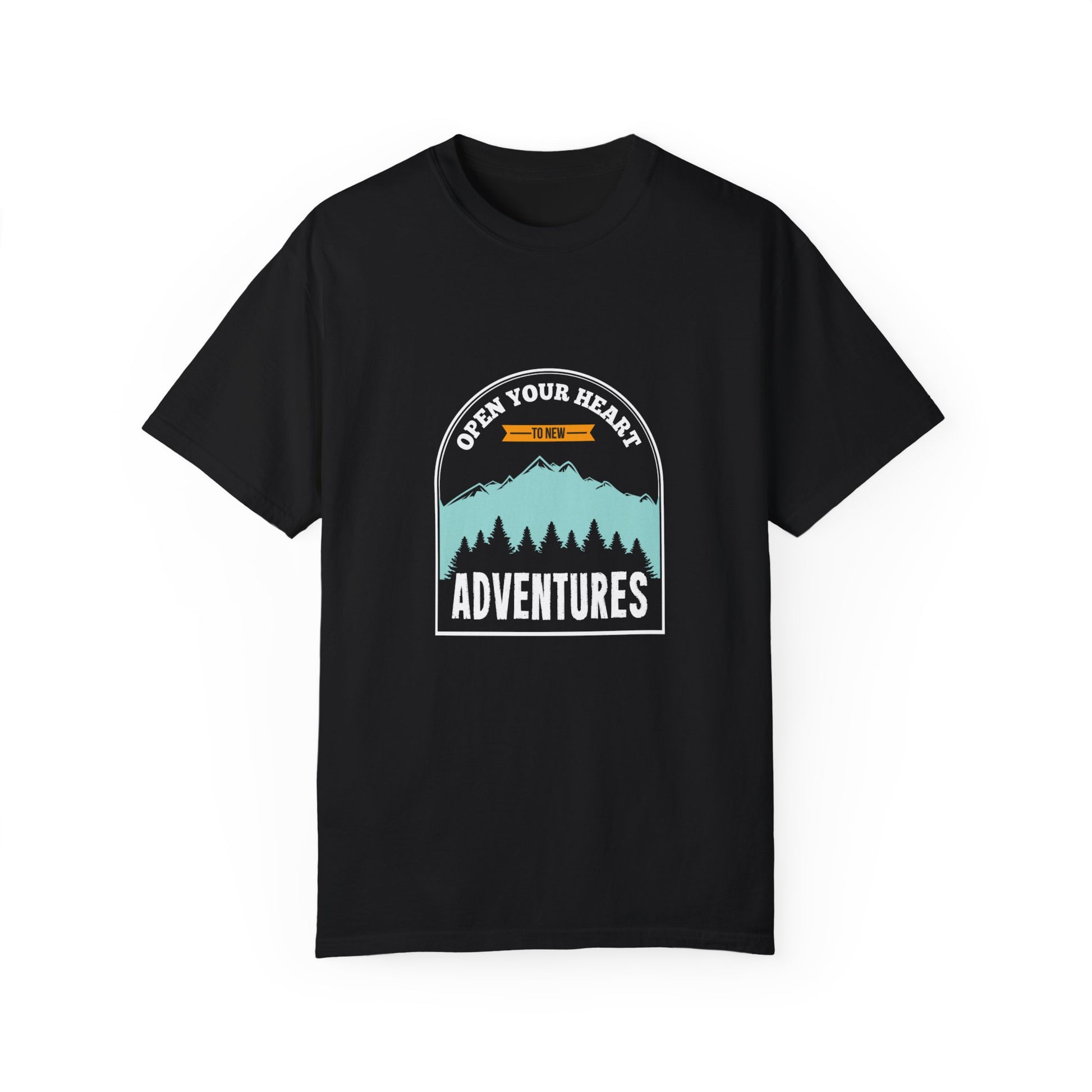 Gear up for your next journey with the Open to Adventure Tee, designed for those who crave the thrill of exploration. Featuring a striking mountain and forest design with the motivational quote "Open Your Heart to New Adventures", this unisex garment-dyed T-shirt is perfect for adventurers, travelers, and outdoor enthusiasts.