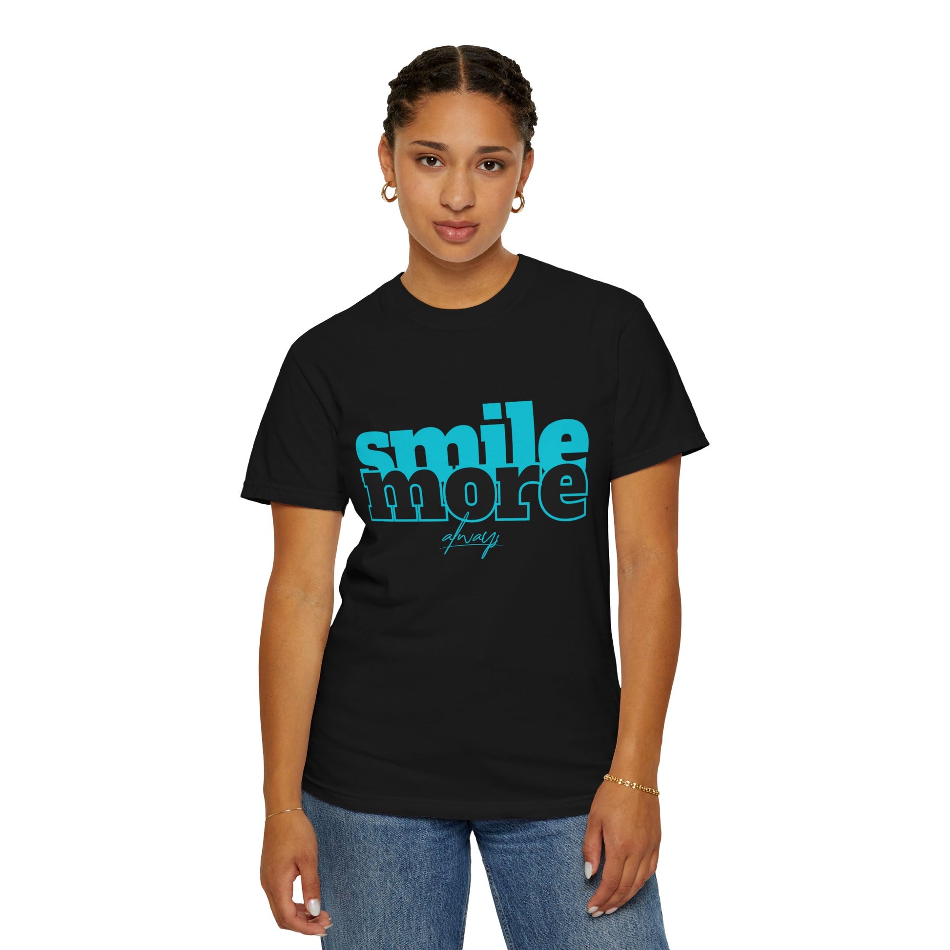 Bring positivity to every day with the "Smile More Always Tee". This unisex garment-dyed T-shirt features a bold and uplifting design with the message "Smile More Always" in vibrant teal typography. Ideal for adding a cheerful vibe to your casual wear, this tee is perfect for everyday adventures and spreading good vibes.